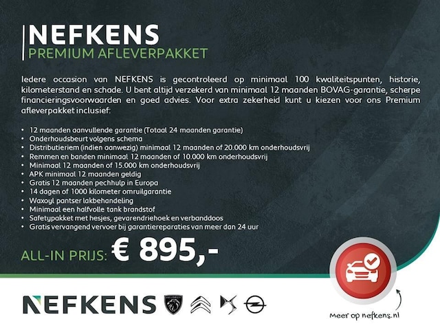 Iedere occasion van Nefkens is gecontroleerd op minimaal 100 kwaliteitspunten, historie, kilometerstand en schade. U bent altijd verzekerd van minimaal 12 maanden BOVAG-garantie, scherpe financieringsvoorwaarden en goed advies. Voor extra zekerheid bieden wij u ons Advanced afleverpakket aan voor € 995,- inclusief: