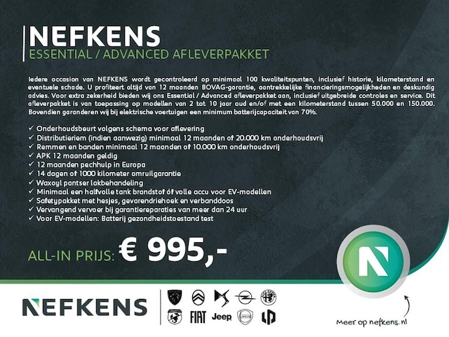 Iedere occasion van NEFKENS wordt gecontroleerd op minimaal 100 kwaliteitspunten, inclusief historie, kilometerstand en eventuele schade. U profiteert altijd van 12 maanden BOVAG-garantie, aantrekkelijke financieringsmogelijkheden en deskundig advies. Voor extra zekerheid bieden wij ons Essential / Advanced afleverpakket aan, inclusief uitgebreide controles en service. Dit afleverpakket is van toepassing op modellen van 2 tot 10 jaar oud en/of met een kilometerstand tussen 50.000 en 150.000. Bovendien garanderen wij bij elektrische voertuigen een minimum batterijcapaciteit van 70%.