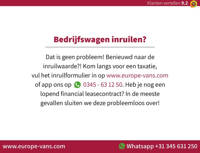 Inruil van uw huidige bedrijfswagen is mogelijk. Financial lease behoort tot de mogelijkheden, op onze site vindt u de tarieven en kunt u direct een aanvraag doen. Alle prijzen zijn exclusief 21% BTW tenzij anders vermeld. Informeer naar aanvullende voorwaarden bij particuliere verkoop. EXPORT: As official VWE-exportpartner we provide all needed documents and services.