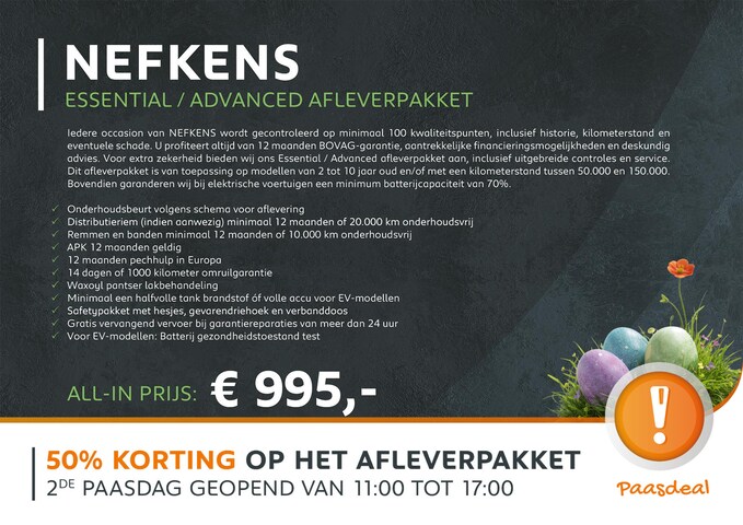 Iedere occasion van NEFKENS wordt gecontroleerd op minimaal 100 kwaliteitspunten, inclusief historie, kilometerstand en eventuele schade. U profiteert altijd van 12 maanden BOVAG-garantie, aantrekkelijke financieringsmogelijkheden en deskundig advies. Voor extra zekerheid bieden wij ons Essential / Advanced afleverpakket aan, inclusief uitgebreide controles en service. Dit afleverpakket is van toepassing op modellen van 2 tot 10 jaar oud en/of met een kilometerstand tussen 50.000 en 150.000. Bovendien garanderen wij bij elektrische voertuigen een minimum batterijcapaciteit van 70%.