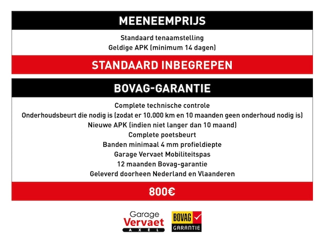 - Garage Vervaet Kwaliteitscheck (zonder meerprijs): De auto wordt op 50 punten gecontroleerd zodat u weet wat u koopt!