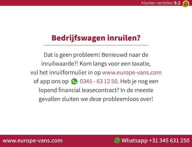 Inruil van uw huidige bedrijfswagen is mogelijk. Financial lease behoort tot de mogelijkheden, op onze site vindt u de tarieven en kunt u direct een aanvraag doen. Alle prijzen zijn exclusief 21% BTW tenzij anders vermeld. Informeer naar aanvullende voorwaarden bij particuliere verkoop. EXPORT: As official VWE-exportpartner we provide all needed documents and services.