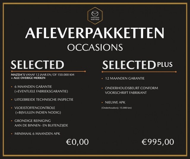 U ontvangt op een ander merk dan Mazda standaard 6 maanden garantie “Selected”, Technische inspectie, Vloeistoffen controle, Grondige reiniging binnen-buitenzijde, en APK voor minimaal 6maanden.