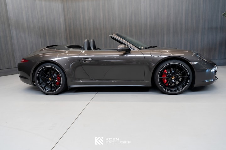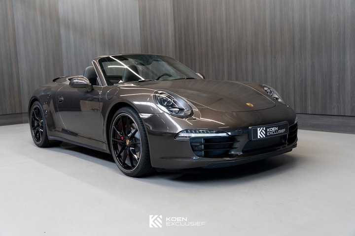 Een mooie Porsche 911 Carrera 4S Cabriolet (991.1) uit 2013, uitgevoerd in antracietbruin metallic met een volledig zwart lederen interieur en een zwart stoffen cabriodak. De auto heeft een kilometerstand van 58.368 km en verkeert zowel technisch als optisch in zeer goede staat.