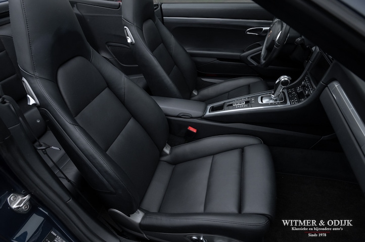 De beste sportauto ter wereld topless rijden is dé ultieme rijbeleving. Gesloten is er geen verschil met de coupe, open prikkelt de auto echt alle zintuigen. Relaxed toeren dankzij de 400pk soepele boxermotor en de automatische PDK versnellingsbak, beweeg de versnellingspook naar manual, schakel handmatig op het stuur, druk ook nog eens op de sportknop en beleef waar een Porsche echt voor is gemaakt. De 911 is nog altijd de beste allround sportwagen ter wereld, praktisch, betrouwbaar, waardevast en dagelijks bruikbaar. Nog nooit wist Porsche haar cabriolet versie van de 911 zo'n mooi strakke, bijna Speedster-achtige, cabrioletkap mee te geven. Gesloten is de daklijn bijna gelijk aan die van de coupe. Laat de foto's spreken. De hier aangeboden auto is uitgevoerd in prachtig Midnight Blu Metallic met een eveneens donkerblauwe cabriokap, is perfect dealer onderhouden en voorzien van alle 'must haves'. Precies zoals u haar wenst, mooi én betrouwbaar. Ja dat bestaat. Zeer compleet met alle opties die een echte stuurman op zijn 911 wil, schakelbare sportuitlaat, Sport Chrono Plus pakket, Porsche Active Suspension Management, automatische climat control, meervoudig electrisch verstelbare stoelen met geheugen, stoelverwarming, stoelkoeling, cruise control, parc distance control voor en achter, blu-tooth telefoonmodule, multifunctioneel Sport Design stuurwiel met schakelpaddles, 20 inch lichtmetalen velgen, Porsche Communication Management met navigatie, Bose luidsprekers met subwoofer, volledig in leer uitgevoerd interieur, elektrisch inklapbaar windscherm, etc. De schadevrije carrosserie van deze Carrera S Cabriolet is blauw in het daglicht, bijna zwart in het donker. Midnight Blue Metallic is de naam van deze schitterende kleur. De bijpassende donkerblauwe cabriokap 'topt' het geheel naadloos af. De strakke kap van de 991 werd ontworpen na uitvoerige windtunnel tests met tevens als doel optisch geen andere lijn in het dak te hebben dan de coupe. De kap is dan ook extreem stil onder alle omstandigheden en is naadloos één geheel, de glazen achterruit ligt er ook mooi verzonken in. Deze 991 heeft zowel op de carrosserie als op de cabriokap geen enkel waarneembaar gebruiksspoor, er is echt geen steenslag of kras op te ontdekken. Het interieur is foutloos, geen zichtbare gebruikssporen binnen in deze cabriolet. Ook de instapzijde van de stoelen is mooi strak en onbeschadigd. Frisse knopjes, nog afleesbaar als ware ze nieuw. Op de vloer originele Porsche matten, echt alles in keurige liefhebbers conditie. Deze Carrera S Cabriolet werd nieuw geleverd door een Nederlandse Porsche dealer. De auto is daar ook altijd aantoonbaar onderhouden. Keurig afgestempeld serviceboekje aanwezig. De complete boordmap met alle instructieboekjes alsmede de reservesleutel is eveneens bij de auto aanwezig. Ook deze Porsche leveren wij inclusief nieuwe APK, garantie en onderhoudsbeurt.