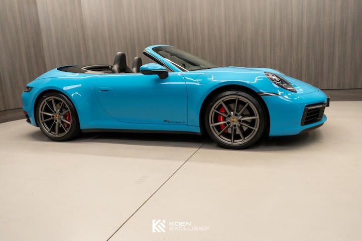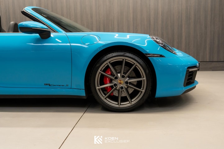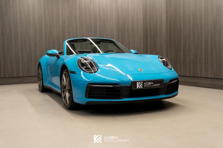Origineel Nederlands geleverde Porsche 911 Carrera S Cabriolet, uitgevoerd in het opvallende Miami Blue met zwarte cabriokap en een zwart vol lederen interieur. De zwarte exterieuraccenten versterken het sportieve karakter en zorgen voor een moderne en krachtige uitstraling.