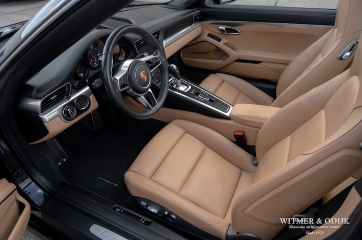 Porsche overtreft zichzelf in het perfectioneren van de Targa bij de introductie van de 991. Was een Targa in het begin vooral gesloten een luidruchtige auto voor de berijders, merkte men in de latere varianten altijd wel iets van de torsie in de auto, niets van dat die eigenschappen treft u in de 991 Targa. Optisch een kunstwerk, technisch een vervolmaking van het Targa concept. Ook op hoge snelheid is de Targa anno 2017 even stil als een coupe, dit dankzij een volledig geautomatiseerd dakmechanisme wat zich ontvouwt als was het een cabriolet, hier dan zonder de nadelen daarvan. Immers de rolbeugel en grote achterruit komen na het openen van het dak terug in hun oorspronkelijke positie. Veilig, stil en bijzonder fraai, bij een Targa 4 staat deze voor de vierwiel aangedreven variant. De niet geringe 370pk die de 6 cilinder boxer motor naar de vier wielen brengt worden bovendien voortdurend bewaakt door de modernste elektronika, alleen met een karrenvracht aan zelfoverschatting krijgt u de 991 Targa 4 nog de bocht uit. Dat voelt ook wel fijn, goed verhaal voor thuis ook. Complimenten over uw nieuwe uiterlijk krijgt u daar nog eens bij, zie de prachtige stijlvolle kleurstelling van deze Targa 4. Uitgevoerd in geheel onbeschadigd zwart metallic gecombineerd met een in ruimtelijk beige interieur wat echt in nieuwstaat is. Dat u verstandig te werk ging kunt u thuis nogmaals aanvoeren als ultiem alibi, deze 991.2 werd altijd aantoonbaar door de officiële Porsche dealer onderhouden. De auto is afkomstig van de tweede eigenaar, een Porsche liefhebber die de auto fanatiek verzorgde. Hij werd niet alleen verliefd op de auto door haar prachtige verschijning, ook de interessante optielijst deed zijn hart sneller kloppen; automatische dual zone climat control, automatische PDK versnellingsbak met desgewenst sportieve handmatige bediening op het stuur, cruise control, stoelverwarming, elektrisch verstelbare stoelen, Porsche Communication Management met digitale radio en navigatie, BluTooth module, 20 inch optionele lichtmetalen velgen, elektrisch verstelbaar sportstuur, bi-xenon en led verlichting, Parc Distance Control rondom, achteruitrijcamera, Porsche Active Suspension Management, schakelbare sportuitlaat, etc. etc. Deze 991.2 Targa 4 is geheel origineel, altijd schadevrij gebleven en vrij van zichtbare gebruikssporen. Alle originele boekjes en servicehistorie voorhanden. Ze staat rijklaar voor u klaar in onze showroom en wordt afgeleverd inclusief nieuwe APK, garantie en onderhoudsbeurt.