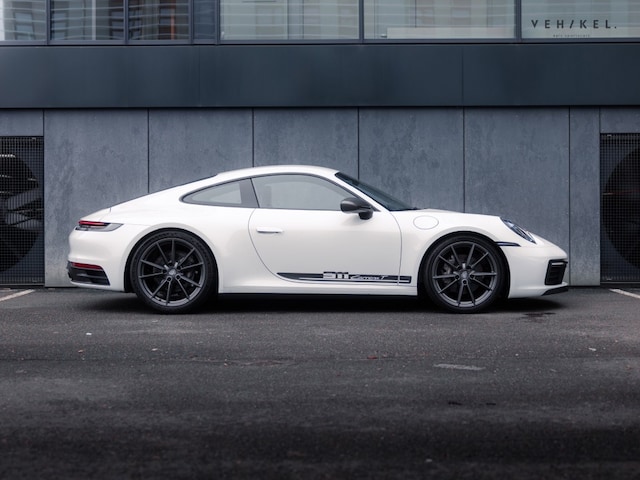 De 911 Carrera T is voorzien van een PDK automatische versnellingsbak - de meest logische keuze voor op landweggetjes en/of het circuit - sportonderstel (PASM), sportuitlaat en minder geluidsisolatie. Binnenin zet de passie voor design en techniek zich in stijl voort met onder andere 4-way Sports Seats Plus, verwarmbaar en bekleed met zwart leder in combinatie met Sport-Tex. De analoge toerenteller plus het klokje uit het Sport Chrono pakket zijn lekker karakteristiek tussen alle digitale systemen. Mag het allemaal even ‘relaxt’, dan is er cruise control aan boord met afstandsregeling. Dankzij de mat zwarte dorpellijsten, het sport GT-sportstuurwiel en de elektrisch verstelbare, verwarmde ‘sportstoelen plus’ voelt u zich meteen thuis aan boord van de Porsche 992. Het 911 logo in de hoofdsteunen en Carrera T-opschrift incl. originele bestickering op de flanken zorgen voor exact de juiste sfeer.