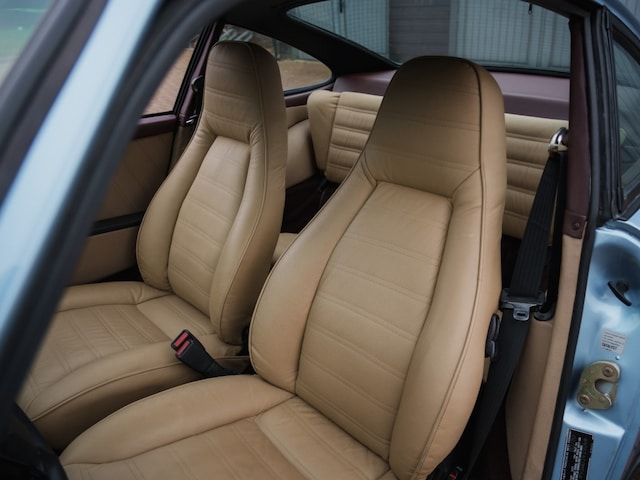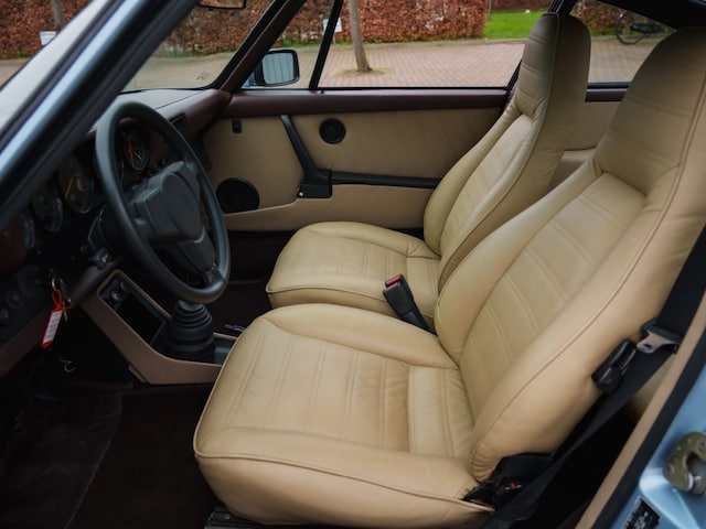 Deze 1980 Porsche 911 3.0 SC Coupé is uitgevoerd in Hell Blue Metallic en beschikt over een interieur in beige leder met donkerbruine accenten.