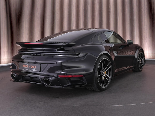 Porsche 911 Turbo S uit 2022, uitgevoerd in het zwart metallic met een volledig zwartlederen interieur. Dit exemplaar is bijzonder rijk uitgerust en samengesteld met oog voor detail. De Turbo S staat bekend als een van de snelste en meest complete 911-modellen ooit gebouwd, en deze configuratie versterkt dat karakter verder met talloze Exclusive Manufaktur-opties.