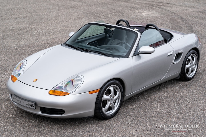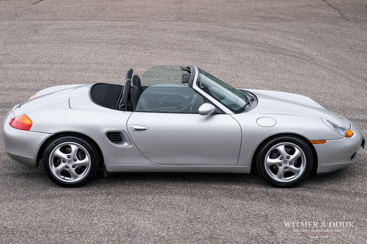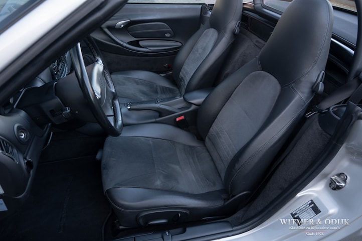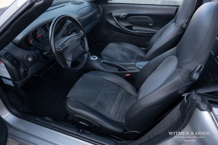 Eén van de beste, leukste en sportiefste cabriolets van de moderne autoindustrie. Immers weinig auto's sturen zo fijn, neutraal én veilig als de Porsche Boxster (een samenvoeging van Boxer en Speedster) dankzij de centraal geplaatste motor. Met als bijkomend voordeel dat het ook de enige open sportwagen is met twee kofferruimtes. De Boxster laat zich, zeker in deze Tiptronic versie, comfortabel toerend berijden om desgewenst even later een volbloed sportwagen te zijn. Middels de op het stuurwiel eventueel ook handmatig te bedienen automatische versnellingsbak schakelt u nét voor de bocht even terug of haalt u snel een andere auto in. Leuk toch? Dit fraaie exemplaar ruilde ik recent in en voor die scherpe inruilprijs nu in de collectie. Zonder voorbehoud onderhouden en altijd schadevrij gebleven. Het is een Boxster uit de tweede serie na het eerste model wat tot 1999 werd gebouwd. Naar mijn mening dé Boxster met de beste prijs/kwaliteits verhouding. Zeer compleet uitgevoerd met automatische climat control, alcantara en leer op de stoelen, elektrische stoelverstelling, automatische Tiptronic-S versnelling met stuurbediening, verstelbaar stuur, elektrische cabriodak bediening, etc. In Arctic Silver Metallic uitgevoerde carrosserie zonder noemenswaardige gebruikssporen. Al het plaatwerk mooi origineel. Altijd garage gestald geweest. Het cabriodak is als nieuw, het achterruitje mooi doorzichtig. Een zeer mooi en origineel geheel. Het zwarte leer en antraciet kleurig alcantara is in zeer mooie en onbeschadigde conditie, evenals de vloer- en dashboard bekleding. Keurige matten op de vloer. Alle schakelaars goed functionerend en nog mooi voorzien van de originele symbolen. Nooit in gerookt. De motor van een Boxster is centraal geplaatst achter de voorstoelen en onzichtbaar weggebouwd. De kofferruimte's zijn nauwelijks gebruikt en derhalve mooi schoon en onbeschadigd. Via de kofferruimte achter vult men olie en de overige vloeistoffen bij. De 17 inch lichtmetalen velgen zijn vrij van parkeerschade en voorzien van zeer goede Michelin Pilot Sport banden.