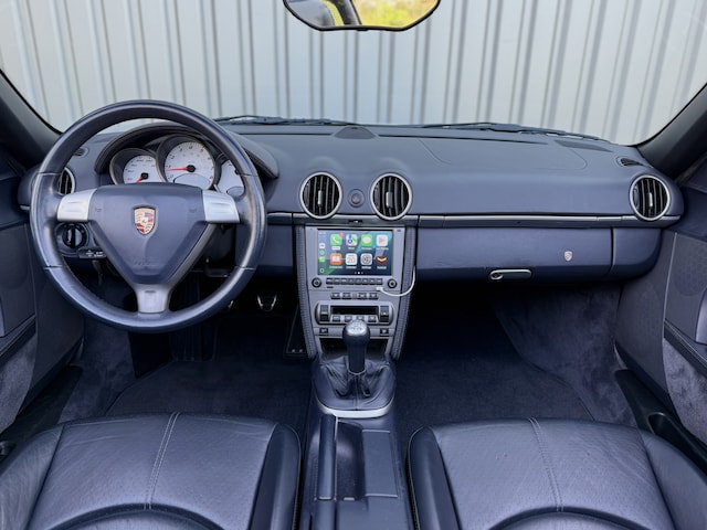 Met hetzelfde gevoel voor stijl werd het interieur aangekleed. De Boxster beschikt in basis over een Zeeblauw lederen binnenwerk. Het zijn echter de kleine details die een groot verschil maken: een Metropol blauwe cabrio-kap met glazen achterruit, aluminium dorpellijsten en luxe afgewerkte stiksels op het dashboard, de deurpanelen en in de stoelen. De comfortabele stoelen houden bestuurder en passagier perfect in hun greep, al geniet de bestuurderszijde duidelijk de voorkeur; alleen al vanwege het zicht op het fraaie sportstuurwiel. Het aluminium interieur-pakket doorbreekt het chique binnenste en biedt het nodige contrast. Medio 2024 is er een PCCM Plus-infotainment systeem [t.w.v. ruim € 2.000] ingebouwd in Heteren. Deze past naadloos in het interieur en biedt, naast een 7-inch touchscreen, talloze moderne mogelijkheden, waaronder Apple CarPlay, Android Auto, DAB-radio, real-time navigatie, Bluetooth, USB en een geïntegreerde microfoon. Allemaal in het Nederlands.