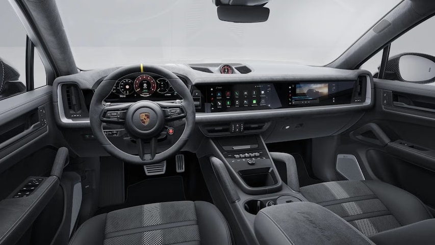 Visueel maakt de Cayenne Turbo E-Hybrid met GT-pakket direct indruk. Met de HD-Matrix LED-koplampen, brede wielkasten en GT-specifieke bumpers ademt hij pure kracht. Binnenin treft u het nieuwe Porsche Driver Experience-concept met een volledig digitaal instrumentarium en hoogwaardige bedieningselementen. Sportstoelen met alcantara-inzet, carbon accenten en een sportstuur met rijmodusschakelaar benadrukken de sportieve inborst.