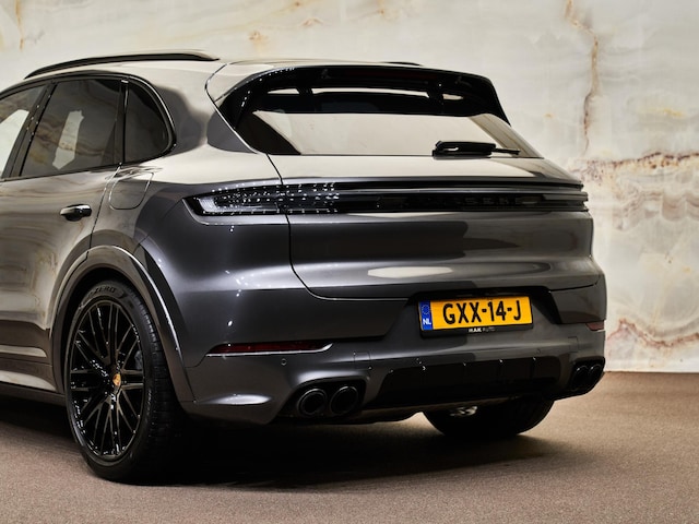 Het sportieve en elegante karakter van deze Cayenne wordt versterkt door het SportDesign pakket hoogglans zwart (2D5), het exterieurpakket zwart hoogglans (QJ4), 22-inch Exclusive Design Sport wielen in Vesuvius grijs (58A) en dakrails aluminium zwart (3S2). Het sportuitlaatsysteem met donker bronzen uitlaatpijpen (0P9) zorgt voor een krachtige uitstraling en bijpassende sound. Details zoals privacyglas (VW6), LED-deurverlichting met ‘PORSCHE’-logo (UD1) en het ‘PORSCHE’ logo in hoogglans zwart (0NT) maken het exterieur compleet.