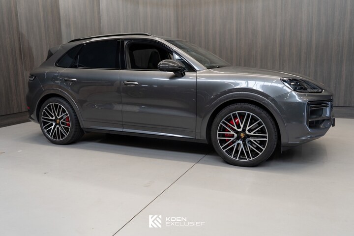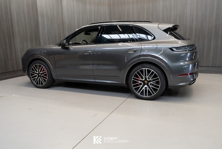 Zeer rijk uitgeruste Porsche Cayenne Turbo E-Hybrid, origineel Nederlands geleverd in november 2024 en uitgevoerd in Kwartsietgrijs metallic met een zwart lederen interieur met contrasterende sticksels en carbon afwerking. De auto heeft een oorspronkelijke nieuwprijs van ruim €243.000 en biedt een uitzonderlijke combinatie van luxe en prestaties.