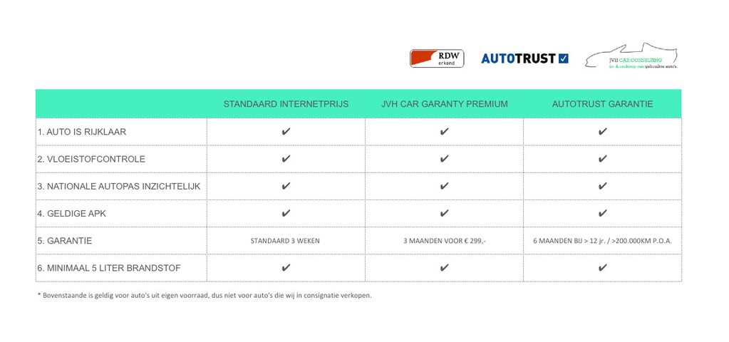 Alle auto’s uit eigen voorraad worden bij JVH CAR CONSULTING voor rijklaarprijzen met wettelijke garantie verkocht. Daarnaast krijgt u bij aanschaf van uw auto voor de rijklaarprijs standaard 3 weken JVH CAR GARANTY. Ook wanneer de auto ouder is dan 12 jaar en/of meer dan 200.000km heeft gereden. Daarnaast kunnen wij u altijd goed vertellen hoe de auto er technisch en optisch bijstaat. En wat wij in de auto hebben moeten investeren om deze rijklaar te laten zijn.