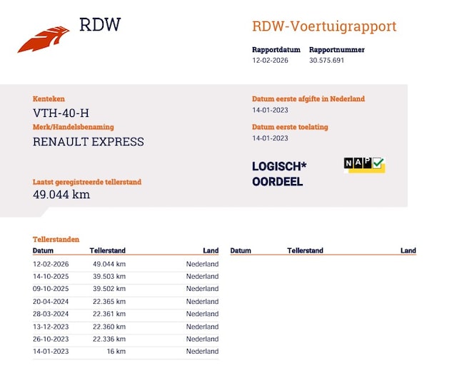 Dat de kilometerstand in orde is, blijkt uit het meegeleverde tellerrapport van Nationale Autopas. Indien u interesse heeft in deze Renault, zetten we hem graag klaar voor een proefrit. We horen graag van u, mailt of belt u ons meteen?