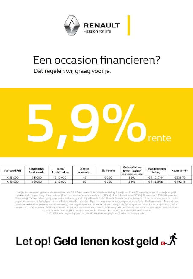 Via Renault Financial Services kunt u de aanschaf van uw nieuwe occasion financieren tegen aantrekkelijke rente en voorwaarden! Op www.renaultfinance.nl kunt u hier meer over lezen. Vraag een van onze verkoopadviseurs naar de mogelijkheden!