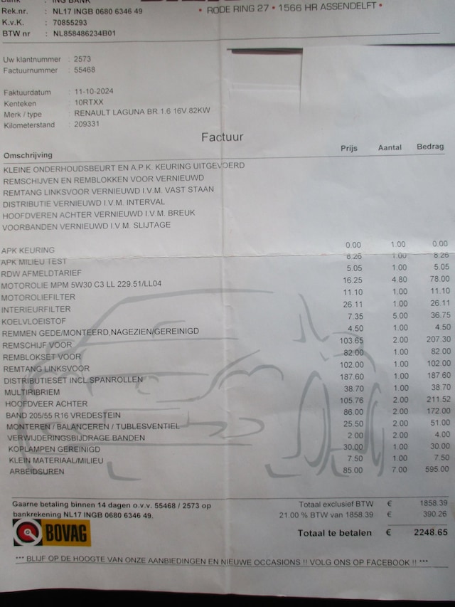 Onderhoudsboekje en alle onderhoudsfacturen aanwezig. Op 209.000 km onderhoudsbeurt, schijven + remblokken, banden, distributie enz. a € 2250,- vervangen (zie foto factuur)