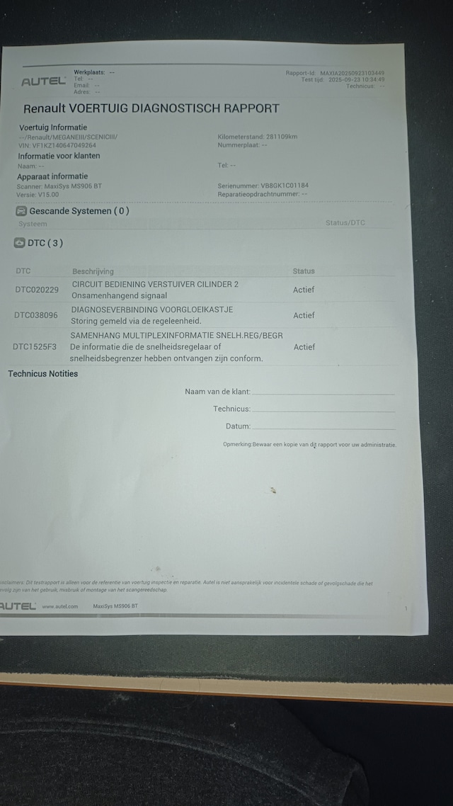 Beschrijving Renault Mégane 1.5 dCi Expression, -Injector 2 moet worden vervangen (testverslag van mijn garage is aanwezig), -Achterremmen zijn bij laatste beurt vervangen, -Auto is momenteel geschorst en onverzekerd, proefrit op openbare weg is niet mogelijk !!, -Bij km stand 240000 is versnellingsbak vervangen, -Elk jaar natuurlijk verse motorolie met filter vervangen, -Bij laatste beurt zijn de achterremmen zijn toen ook vervangen, Auto heeft nog een geldige APK tot 08 mei 2026, extra optie : 4 winterbanden met stalen velg, sluitende NAP aanwezig ! (origineel NL auto), Achterbank neerklapbaar (ongelijke delen), Carminat TomTom live navigatie met kleurenscherm, Centrale deurvergrendeling afstandsbediening, Handsfree telefoonbediening met bluetooth, Stuurbekrachtiging snelheidsafhankelijk