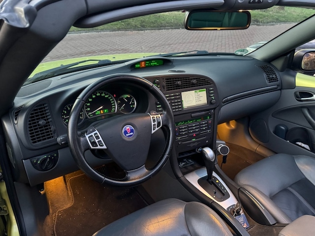 Deze 9-3 cabriolet is uitgevoerd in het prachtige en exclusief voor de cabriolet leverbare lime yellow metallic. Van binnen voorzien van een grijs/zwart leren interieur wat de auto in combinatie met de 17" Aero lichtmetalen velgen zowel een chique als sportief voorkomen geeft. Daarnaast is deze 9-3 voorzien van een volledig Aero pakket met bredere voorspoiler, Aero zijskirts, achterskirt met zichtbare sport uitlaat en een klein achterspoilertje maakt het helemaal af. In het interieur vinden we de heerlijk zittende leren stoelen, een leren sportstuur en aluminium interieur afwerking.
