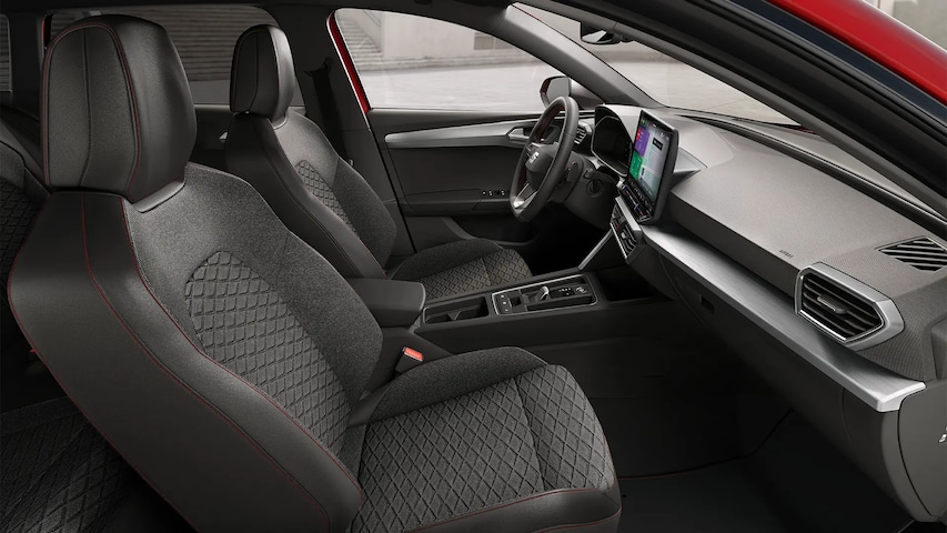 Interieur: Bekleding stof Two-tone Grey & Lava Red stiksels