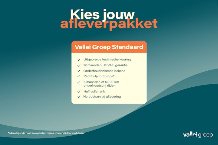 Deze auto wordt door ons geleverd met het Vallei Groep Standaard afleverpakket. Dat betekent dat de auto vooraf is onderworpen aan een uitgebreide technische keuring, professioneel is gecontroleerd en verzorgd wordt afgeleverd. Je profiteert daarbij van 12 maanden BOVAG garantie, Europese pechhulp en een bekende historie.