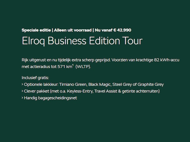 Skoda Elroq - Business Edition Tour Elektromotor 210 kW / 286 PK | Metallic Lak | 17% Bijtelling