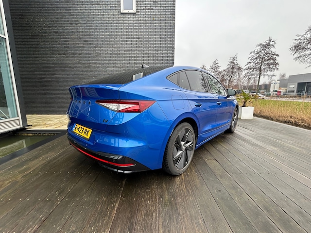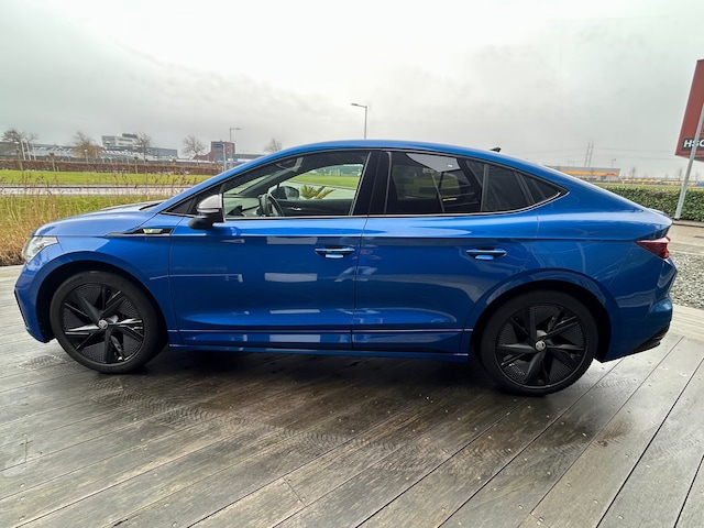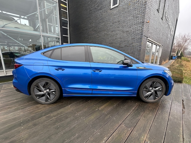 Mooie Skoda Enyak Coupe iV80 RS in de kleur Azul Oceano, voorzien van de 82kWH sterke accu wat resulteert in een vermogen van 300Pk met een rijbereik van 522Km (WLTP) voorzien van vele opties, de RS sportuitvoering maakt van deze skoda een sportieve electrische auto.