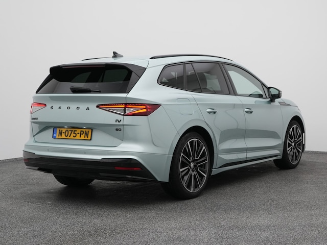 Zodra u naar de 'R' schakelt, gaat de achteruitrijcamera in werking en heeft u een perfect zicht op alles wat zich achter de auto afspeelt. Electronic climate control verwarmt of koelt het interieur met een druk op de knop. Natuurlijk is een complete auto als deze ook voorzien van sensoren die de omgeving in de gaten houden. Deze ŠKODA heeft niet alleen een automatisch inschakelbare verlichting aan boord, maar ook een regensensor. Cruise control is aanwezig; prettig voor de lange einden. Een prettige optie is de keyless entry, die ervoor zorgt dat de ŠKODA Enyaq iV automatisch van het slot gaat als u dichtbij komt. Deze auto is voorzien van dashboard met spraakbediening, full map navigatiesysteem, schakelpaddles aan het stuur, DAB ontvangst, automatisch dimmende binnenspiegel en centrale deurvergrendeling met afstandsbediening.