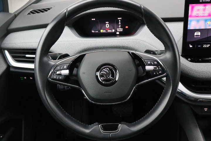 Duurzaam en dynamisch, de Skoda Enyaq iV verenigt deze twee uitersten in zich. Dit is een auto uit 2022, er staat 34365 kilometer op de teller. Dankzij de automatische transmissie en elektrische aandrijving, navigeert u gemakkelijk door het verkeer. Het is een nieuwe auto, hij is nu uit voorraad leverbaar. Een krachtige motor geeft deze auto zijn sportieve prestaties. Met matrix LED-verlichting rijdt u eigenlijk altijd met groot licht, dus maximaal zicht. Toch is verblinden er niet bij, want het systeem regelt de verlichting zo dat tegenliggers er geen last van hebben. In deze Skoda profiteert u onder andere ook van: 19 inch lichtmetalen velgen, in hoogte verstelbare passagiersstoel, in delen neerklapbare achterbank, LED-achterlichten, verstelbare lendensteunen en verwarmde ruitensproeiers. Natuurlijk brengt het digitale dashboard alle ritinformatie perfect in beeld. Maar ook communicatie, navigatie en tal van andere functies zijn permanent te volgen. Hoeveel ruimte heeft u nog bij het inparkeren? De achteruitrijcamera brengt helder in beeld wat zich achter de auto bevindt en geeft een geluidssignaal. Hoe is het met de banden, de accu en andere onderdelen? Connected Services maakt het inzichtelijk, 24/7 via de app. Voor een veilige rit is het belangrijk dat uw handen het stuur vasthouden en uw ogen gefocust blijven op de weg; daarom kunt u het audiosysteem, met DAB-ontvangst en full map navigatiesysteem bedienen met het stuurwiel of via spraakbediening. In een auto als deze kunt u niet zonder electronic climate control, zodat de temperatuur altijd goed is. U bent in deze Skoda ook voorzien van sportstuur met schakelpaddels, regensensor, cruise control, automatisch dimmende binnenspiegel en centrale deurvergrendeling met afstandsbediening. Het zal u verbazen hoe deze auto in staat is om voor u de omgeving en het verkeer om u heen in de gaten te houden. Met het Lane-keeping systeem gaat u nooit onbedoeld over de streep. Het risico van een kop-staartbotsing wordt aanzienlijk verminderd door de forward collision warning. De veiligheid van deze auto wordt verder verhoogd door autonoom remsysteem en bandenspanningcontrolesysteem. Natuurlijk is dit een splinternieuwe auto en hij wordt dus geleverd met volledige fabrieksgarantie. Daarbij kunnen we u verschillende gunstige financieringsvormen aanbieden. We maken graag een afspraak met u.
