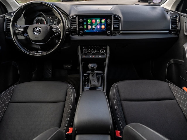 Met adaptive cruise control houdt deze auto automatisch afstand tot uw voorligger. Zoals u van zo'n jonge auto mag verwachten, zijn hier ook de geavanceerde remote services aanwezig. Simpelweg met een app op uw smartphone controleert u op afstand de status van de auto en bedient u diverse functies. Voor een veilige rit is het belangrijk dat uw handen het stuur vasthouden en uw ogen gefocust blijven op de weg; daarom kunt u het audiosysteem, met DAB-ontvangst en navigatiesysteem bedienen met het stuurwiel of via spraakbediening. De auto is ook uitgevoerd met automatische airconditioning. Een plekje vinden in de binnenstad is één, inparkeren is twee. Voor dat laatste heeft deze Skoda Karoq prima parkeersensoren die u een handje helpen. De uitrusting van deze auto is met regensensor, keyless Go, automatisch dimmende binnenspiegel, lederen stuur, isofix-aansluiting en usb-aansluiting behoorlijk compleet.