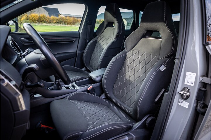 Fraaie Skoda Karoq in sportieve uitvoering en complete uitrusting. Lakkleur is Steel Grey en het interieur is voorzien van een combinatie van sportstoelen in antraciet Dynamic stof.