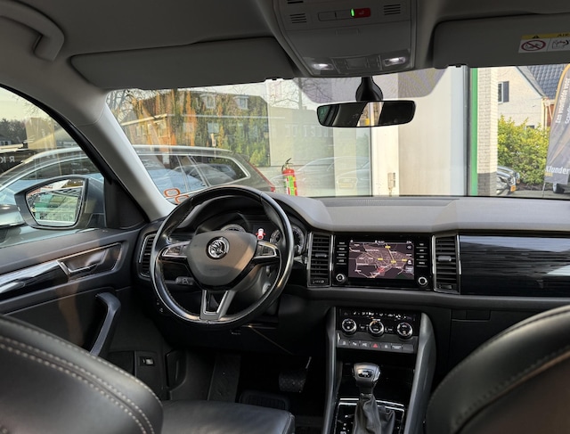 Wat een ruimte in deze Kodiaq en zelfs ruimte voor 7 personen. De Carrosserie is uitgevoerd in de kleur Business Grey. De zijruiten vanaf de B-stijl en de achterruit zijn voorzien van Privacy Glas wat het uiterlijk in combinatie met de 19" lichtmetalen velgen helemaal af maakt. Het interieur is volledig in zwart Leder afgewerkt, zowel de bestuurders- als de passagiersstoel is volledig elektrisch verstelbaar met geheugen voor 3 posities en zijn tevens verwarmbaar. Navigeren kan via de originele Navigatie of via het Smartlinksysteem i.c.m. uw mobiele telefoon. Het openen en sluiten en starten van de Skoda gaat keyless. De 360° Camera maakt parkeren eenvoudig.
