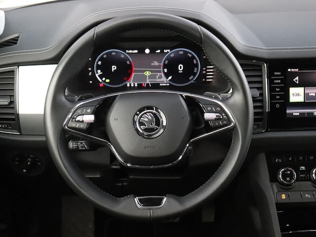 De achteruitrijcamera maakt inparkeren gemakkelijker dan ooit. Met adaptive cruise control houdt de auto zelfstandig afstand tot jouw voorligger. Een veiligheidsverhogende optie waarmee je comfortabel onderweg bent. Filerijden? Doodvermoeiend. Daarom helpt de file assistent zo nodig een handje. Door automatisch afstand te houden, en te stoppen als je voorligger stilstaat. Omdat je niet elke dag met een aanhanger of caravan op pad bent, is er de elektrisch inklapbare trekhaak. In deze Kodiaq vind jij niet alleen schakelaars op het stuur om het navigatiesysteem te bedienen en het audio-installatiesysteem met DAB-ontvangst, maar er is ook spraakbediening. Deze auto is voorzien van achteropkomend verkeer waarschuwing, electronic climate control, draadloos opladen, regensensor, keyless entry en automatisch dimmende buitenspiegels.