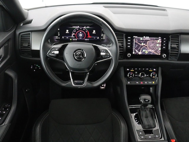 Via het digitale dashboard bent u permanent op de hoogte van alle informatie die u nodig heeft voor een veilige rit. Hoeveel ruimte heeft u nog bij het inparkeren? De achteruitrijcamera brengt helder in beeld wat zich achter de auto bevindt en geeft een geluidssignaal. Met de ingebouwde spraakbediening kunt u de belangrijkste voertuigsystemen bedienen met stemcommando's. Deze Skoda Kodiaq is voorzien van remote services. Via uw smartphone bedient u diverse functies ook op afstand en krijgt u informatie over de status van uw auto. Smakelijke subs en knisperend hoog: het high performance audiosysteem geeft elke frequentie een kwaliteitsbehandeling voor akoestisch genieten onderweg. De uitrusting van deze auto is met full map navigatiesysteem, achteropkomend verkeer waarschuwing, electronic climate control, sportstuur met schakelpaddels, draadloos opladen en DAB ontvangst behoorlijk compleet.