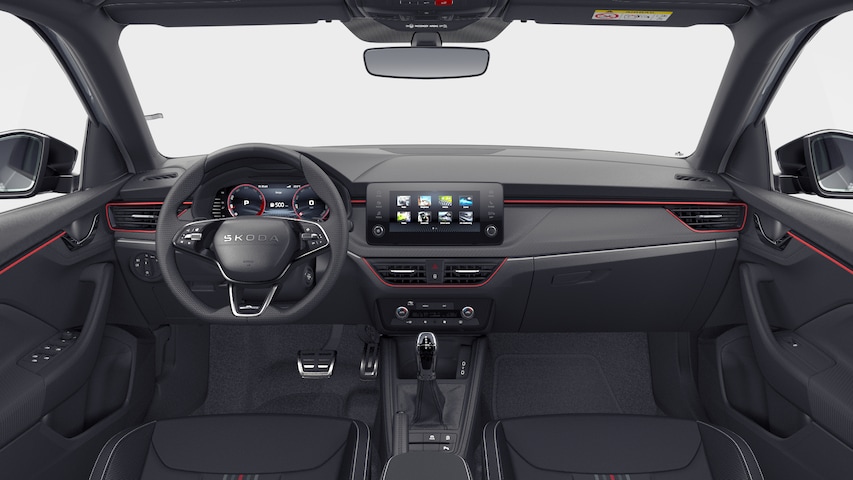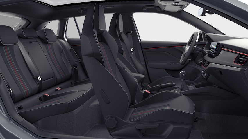 - Interieur "Monte Carlo" met zwart stoffen/suedia bekleding en sportstoelen