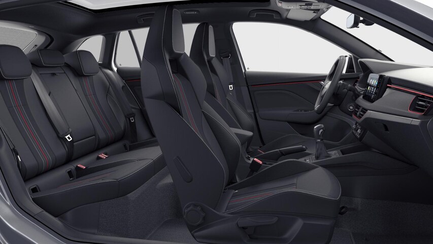 - Interieur "Monte Carlo" met zwart stoffen/suedia bekleding en sportstoelen