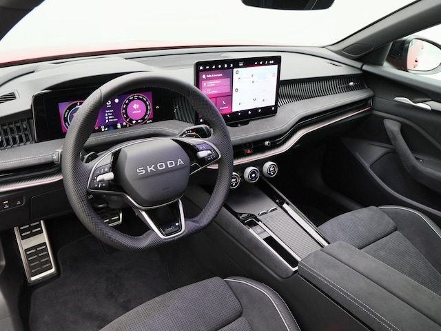 Het interieur ademt sportiviteit met zijn zwarte hemelbekleding, comfortabele sportstoelen en hoogwaardig afgewerkt dashboard. De aandrijflijn biedt niet alleen prestaties, maar ook rust: volledig elektrisch rijdend is deze Superb fluisterstil, soepel en bijzonder zuinig.