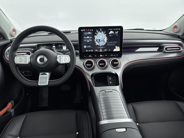 Een nieuw tijdperk breekt aan. Emissievrij rijden is niet langer toekomstmuziek met deze elektrische smart #3. Gas geven is er met de elektromotor niet meer bij. Stil snelheid maken wel! Deze smart #3 is luxe afgewerkt. Kijk maar naar het lederen interieur! De verwarmbare voorstoelen zijn een heerlijke extra optie, waarmee je jezelf en je bijrijder een groot plezier doet. Een praktische extra is de elektrisch bedienbare achterklep die opent en sluit met een druk op de knop. Het glazen panoramadak zorgt voor een onovertroffen uitzicht. Zo'n verwarmd stuurwiel is een comfortabele extra, zeker in de winter. De matrix LED-verlichting in de koplampen bestaat uit een raster van lichtpunten met maximale opbrengst. Bij tegenliggers past het systeem precies die punten aan die hinderlijk kunnen zijn. Je behoudt maximaal zicht! Ook is de auto voorzien van: 19 inch lichtmetalen velgen, warmtewerend glas, trailer assistent, in delen neerklapbare achterbank, LED-achterlichten en verstelbare lendensteunen.