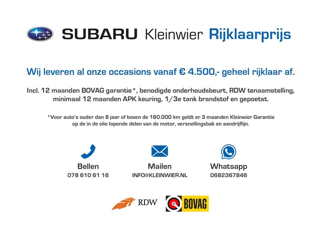 De geavanceerde technologie in deze Subaru is in staat om onderweg het verkeer om u heen te monitoren en er op te reageren. Zo hebt u als het ware een automatische co-piloot aan boord. Veiligheid voorop: sensoren van de lane assist scannen de rijstrookstrepen en waarschuwen als u onbedoeld over de lijn gaat. Bovenop deze veiligheidsfeatures heeft deze Subaru bovendien dodehoekdetectie en hill start assist.