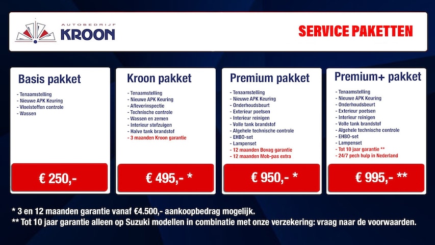 - Kroon pakket (€ 495): Dit afleverpakket bevat: BOVAG 40-Puntencheck; Afleveringsinspectie, nieuwe APK, technische controle, wassen/zemen/zuigen, 1/2 volle tank, 3 maanden Kroon garantie