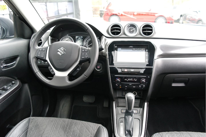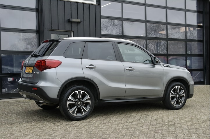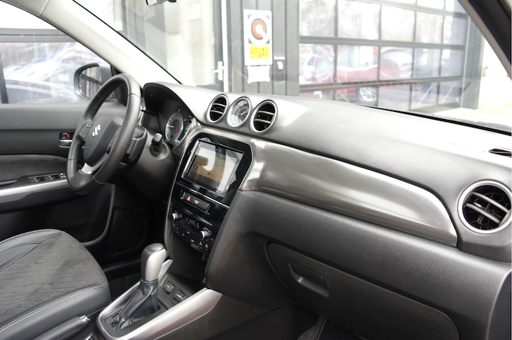 Frisse Suzuki Vitara 1.4 Boosterjet Stijl Automaat voorzien van de volgende opties: adaptive cruise control, 17'' lichtmetalen velgen, panoramadak, stoelverwarming, achteruitrijcamera, getint glas, LED verlichting, half leder/stof, dodehoekdetector, isofix, etc.