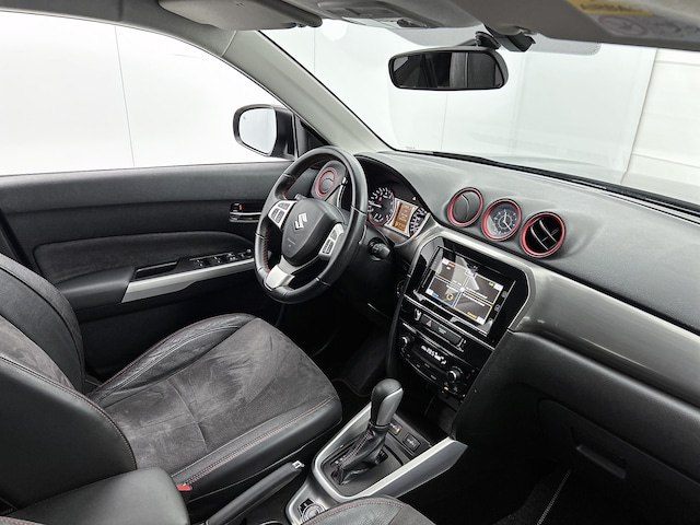 Bij het inparkeren hoef je het laatste stukje niet te gokken: de achteruitrijcamera kijkt voor je uit. Als je de adaptive cruise control inschakelt, regelt de auto zelf de snelheid en de afstand tot de auto voor je. Onderweg kun jij veilig genieten van het audio-installatiesysteem en het full map navigatiesysteem. Want in deze Suzuki bedien je ze vanaf het stuurwiel. Het comfort wordt verhoogd door de aanwezige automatische airconditioning. Het hoort bij een intelligente auto als deze dat hij zelf in staat is om zijn omgeving in de gaten te houden. Dat doet deze Suzuki met een automatisch inschakelbare verlichting en een regensensor. Natuurlijk behoren schakelpaddles aan het stuur, centrale portiervergrendeling en boordcomputer ook tot de uitrusting van deze complete auto.