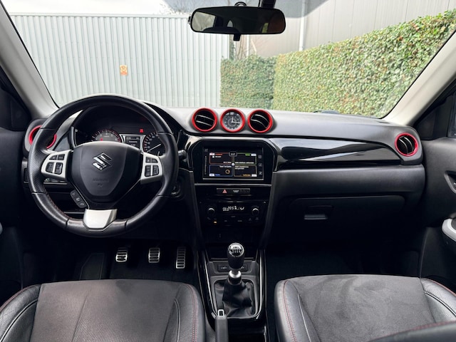 Sportieve en luxe uitgevoerde SUZUKI VITARA voorzien van de pittige 1.4 4-cilinder turbomotor met 140pk én het "S" pakket, zwart exterieur met zwart leder/alcantara interieur en voorzien van rode accenten.