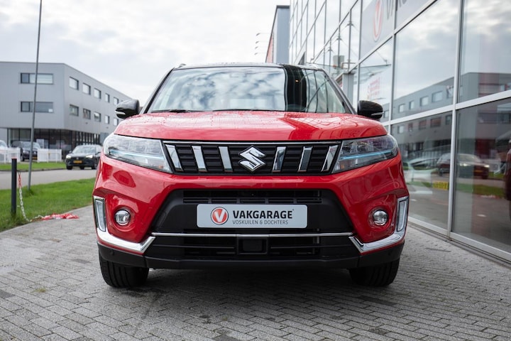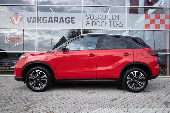 Te koop: een prachtige Suzuki Vitara 1.5 Hybrid Automaat in de luxe Style-uitvoering, uitgevoerd in een opvallende rode kleur met zwart dak en zwarte spiegelkappen. Deze stijlvolle SUV combineert sportiviteit met comfort en efficiëntie.
