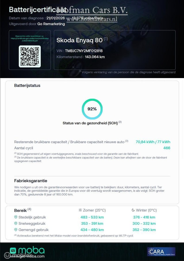 - Actieradius (WLTP‑indicatie): circa 480 km