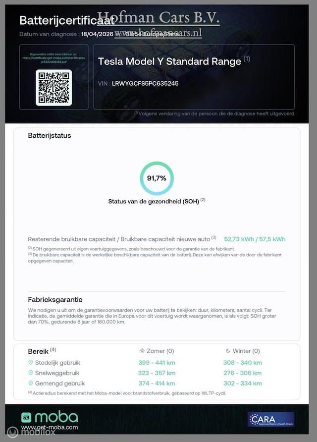 Deze uitvoering is voorzien van de LFP (Lithium Iron Phosphate) accu van 58 kWh. De Actuele SOH (gemeten middels MOBA Test en inclusief Certificaat 91,7%) Dit type batterij staat bekend om zijn betrouwbaarheid en praktische voordelen in dagelijks gebruik.