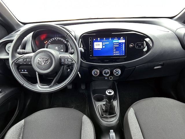 Een onopvallend paaltje of een overstekend kind achter de auto brengt risico's met zich mee. Gelukkig laat de achteruitrijcamera feilloos zien of alles veilig is. Als je de adaptive cruise control inschakelt, regelt de auto zelf de snelheid en de afstand tot de auto voor je. Verwende oren worden blij van het topkwaliteit audiosysteem met DAB-radio. Aan boord van deze Toyota Aygo X is een achteropkomend verkeer waarschuwing voor extra veiligheid. Het hele jaar door zorgt airconditioning voor een prettige temperatuur. Extra opties op deze auto zijn: lederen stuur en centrale deurvergrendeling met afstandsbediening.