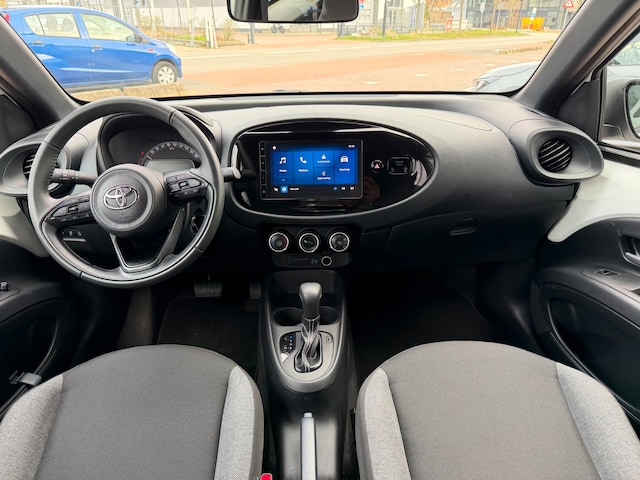 Afstand schatten bij het achteruitrijden? Niet nodig. U weet het precies, dankzij de achteruitrijcamera. Adaptive cruise control houdt de ingestelde snelheid vast en houdt afstand tot het voertuig voor u. Met DAB-radio heeft u onderweg veel keuze in zenders en genres. Uw oren worden verwend met het perfecte audiosysteem. Aan boord van deze Toyota Aygo X is een achteropkomend verkeer waarschuwing voor extra veiligheid. Met één druk op de knop blaast de airconditioning een koele bries door het interieur. Ook lederen stuur en centrale deurvergrendeling met afstandsbediening horen tot de voorzieningen op deze auto.